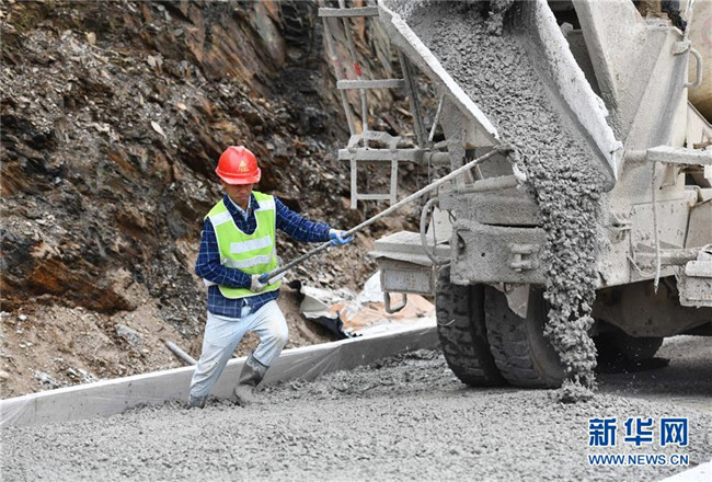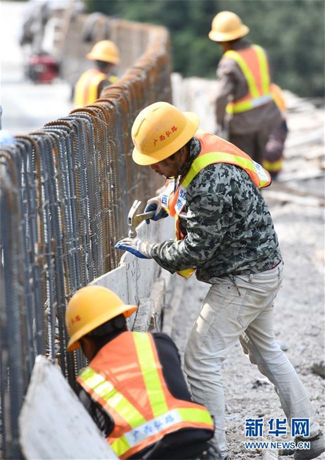 11月19日,在廣西融水苗族自治縣四榮鄉(xiāng),工人在羅融二級(jí)公路建設(shè)現(xiàn)場(chǎng)施工。 新華社記者 黃孝邦 攝