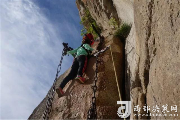 鷂子翻身:“鷂子翻身”在華山東峰,是通往華山著名景點(diǎn)—宋代開(kāi)國(guó)皇帝趙匡胤和陳摶老祖博弈之處的必經(jīng)之險(xiǎn)道。其路鑿于倒坎懸崖上,只見(jiàn)鐵索寒瑟,紫霧繚繞,云瀑倥傯,鷹鷂哀鳴,四周景色絕佳、就是難覓行徑。游人至此,須面壁挽索,伸腳探尋石窩,交替而下。
