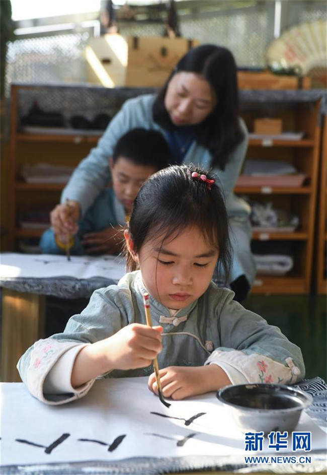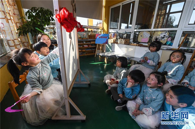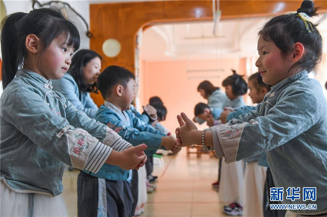 從2019年初開(kāi)始,浙江省湖州市南太湖幼兒園開(kāi)啟“國(guó)學(xué)課堂”,通過(guò)設(shè)立傳統(tǒng)禮儀、書(shū)法、剪紙、京劇、皮影戲等國(guó)學(xué)傳統(tǒng)文化課程,致力于將國(guó)學(xué)經(jīng)典教育滲透到幼兒日常生活學(xué)習(xí)中,培養(yǎng)幼兒的古典文化底蘊(yùn),教育幼兒從小培養(yǎng)良好的禮儀行為,讓幼兒們?cè)趥鹘y(tǒng)國(guó)學(xué)文化的滋養(yǎng)中成長(zhǎng)。 新華社記者 徐昱 攝