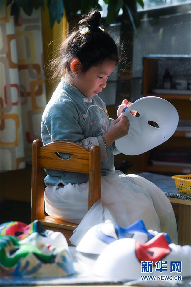 11月28日,小朋友在傳統(tǒng)書(shū)畫(huà)課上學(xué)習(xí)畫(huà)臉譜。