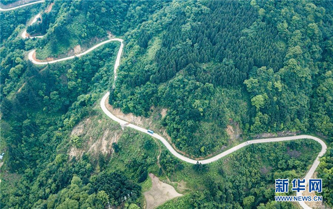 “通村村”車輛行駛在貴州省雷山縣大塘鎮(zhèn)的鄉(xiāng)村公路上(5月24日無人機(jī)拍攝)。 新華社記者 陶亮 攝