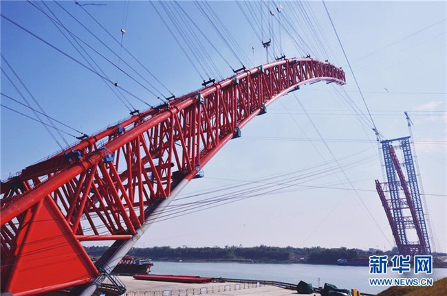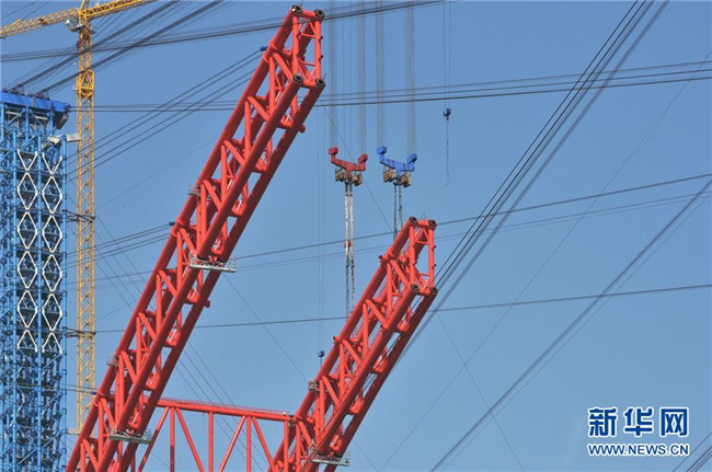 工人在進(jìn)行大橋主拱拱肋吊裝作業(yè)(12月8日攝)。