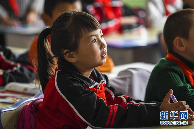 在哈密幸福村小學(xué)里,孩子們?cè)谟秒姴膳慕淌依锷险n(10月22日攝)。新華社記者 趙戈 攝