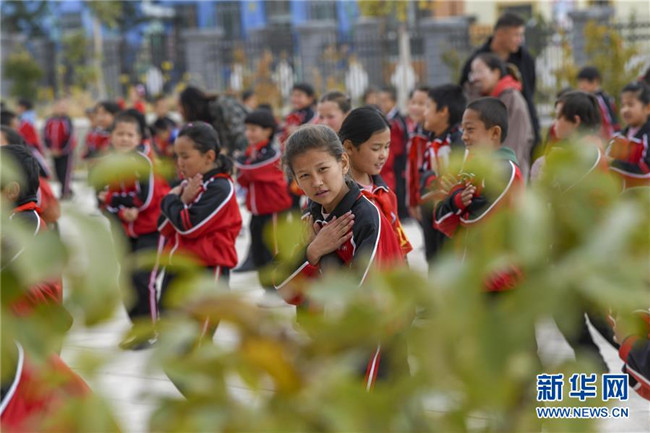 在哈密幸福村小學(xué)里,孩子們?cè)谧稣n間操(10月22日攝)。新華社記者 趙戈 攝