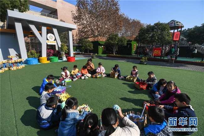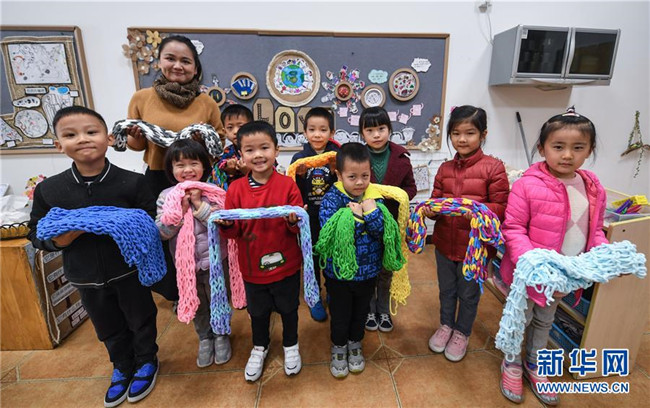 12月11日,小朋友們在老師的帶領(lǐng)下用紙盒制作的工具編織愛心圍巾。新華社記者 徐昱 攝