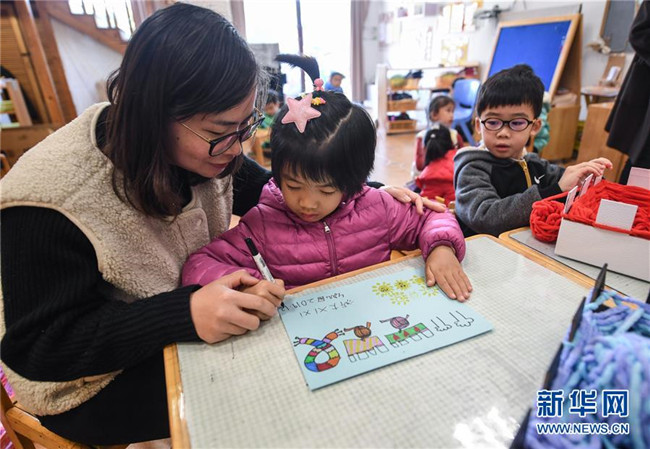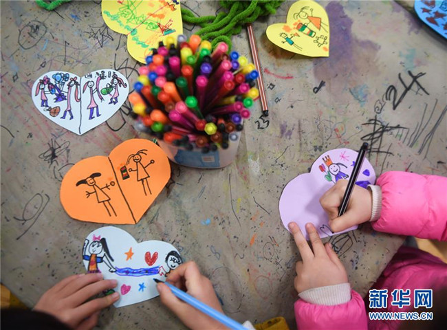 12月11日,小朋友在老師的帶領(lǐng)下繪制愛心卡片,準備隨圍巾一起寄給西藏的小朋友們。 新華社記者 徐昱 攝