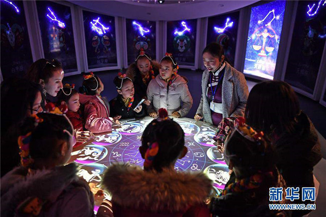 12月14日,拉薩市實驗小學學生在藏域星球天文科普體驗館學習星座知識。當日,藏域星球天文科普體驗館在西藏拉薩開館試運營,這是西藏第一家天文科普體驗館。據介紹,此館以感知宇宙、認知宇宙、探索宇宙為主題,以參觀者的第一感官體驗為設計導向,利用互動投影、懸浮投影、物體跟蹤、人體捕捉、體感互動、VR等高科技手段展示藏地的神秘,揭示宇宙的奧秘。新華社記者李鑫攝