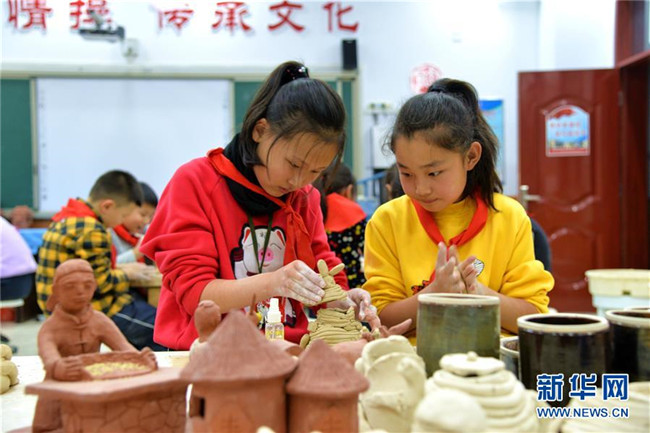 12月16日,清水河縣城關(guān)鎮(zhèn)第一小學(xué)學(xué)生在制作陶器。新華社記者 徐欽 攝