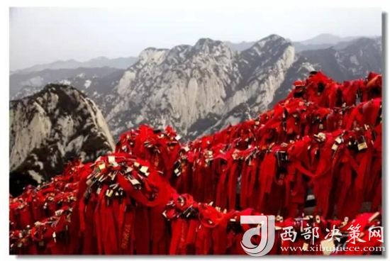 華山是一座愛情的殿堂。發(fā)生在華山上的每一個愛情故事都讓人感動、讓人頂禮膜拜。眾所周知的神話傳說《寶蓮燈》中,三圣母為了愛情,被二郎神用巨石壓在華山峰下;弄玉為了愛情,逃離安逸的生活,與蕭史雙雙來到華山,琴瑟合鳴;漢臣王咸不畏艱險,到華山尋找賢妻南陽公主等等這些愛情故事,感天動地,流傳不衰。也許是讓華山上這些動人的愛情故事所感染,不知從什么時候開始,游人將自己對美好愛情的向往,對理想愛情固若磐石的期望用一把把閃閃的金鎖,堅定的鎖在了華山之上,在華山的見證下,在華山神的保佑下,舉案齊眉、白頭偕老。