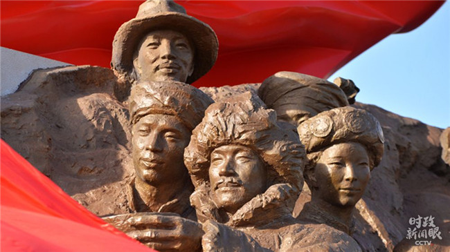 △鄂豫皖蘇區(qū)首府革命博物館前英雄廣場(chǎng)上的主題雕塑:?jiǎn)⒑叫麻L(zhǎng)征。