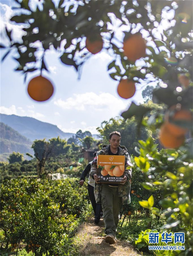 1月8日,云南省昆明市祿勸彝族苗族自治縣屏山街道岔河村農(nóng)戶在采收臍橙。新華社記者 江文耀 攝