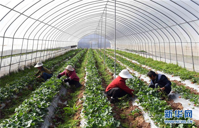 1月9日,云南省富民縣散旦鎮(zhèn)漢營村農民在草莓種植基地除草。 新華社記者楊宗友攝
