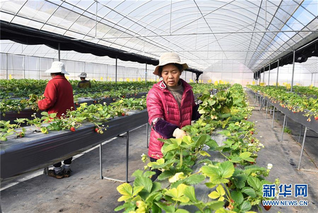 1月9日,游客在云南省富民縣散旦鎮(zhèn)漢營村草莓種植基地采摘。 新華社記者楊宗友攝
