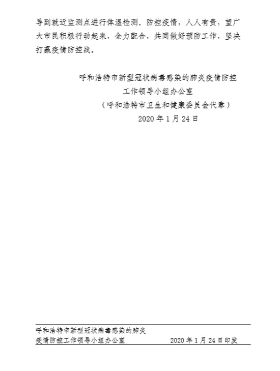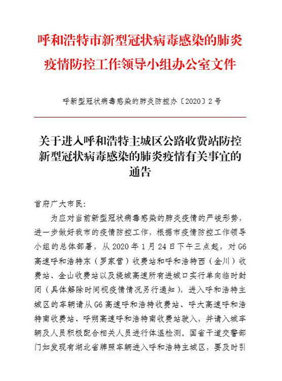 記者從呼和浩特市新型冠狀病毒感染的肺炎疫情防控工作領(lǐng)導(dǎo)小組辦公室獲悉,為應(yīng)對(duì)當(dāng)前新型冠狀病毒感染的肺炎疫情的嚴(yán)峻形勢(shì),進(jìn)一步做好呼和浩特市的疫情防控工作。從2020年1月24日下午三點(diǎn)起,對(duì)G6高速呼和浩特東(羅家營(yíng))收費(fèi)站和呼和浩特西(金川)收費(fèi)站、金山收費(fèi)站以及繞城高速所有進(jìn)城口實(shí)行單向臨時(shí)封閉(具體解除時(shí)間視疫情情況另行通知)。進(jìn)入呼和浩特主城區(qū)的車(chē)輛請(qǐng)從G6高速呼和浩特收費(fèi)站、呼大高速呼和浩特南收費(fèi)站、呼朔高速呼和浩特南收費(fèi)站駛?cè)?,并?qǐng)入城車(chē)輛及人員積極配合相關(guān)人員進(jìn)行體溫檢測(cè)。