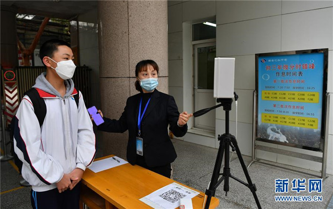 4月7日,西安匯知中學初三學生進入校園時測量體溫。