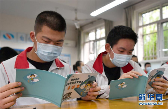 4月7日,西安匯知中學初三學生閱讀由學校老師繪制的防疫繪本。