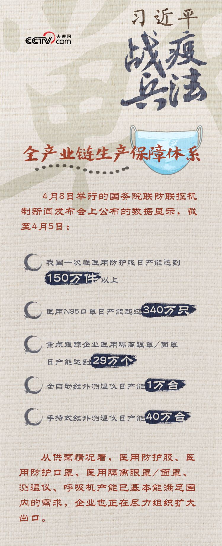截至4月2日,國務(wù)院聯(lián)防聯(lián)控機(jī)制醫(yī)療物資保障組累計為湖北等地區(qū)調(diào)撥了醫(yī)用防護(hù)服超過800余萬件,醫(yī)用隔離面罩(眼罩)165萬個,免洗手消毒液357噸,手持紅外測溫儀66萬臺,負(fù)壓救護(hù)車1000余輛,呼吸機(jī)等醫(yī)療救治設(shè)備超過了7萬臺套。