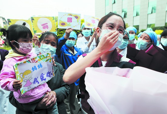 “看到你們平安回來,我們就放心了!”下午2點40分左右,當隊員們走下大巴車時,早已等候在此的醫(yī)院領(lǐng)導(dǎo)、職工和家屬紛紛迎上前去,為他們獻上鮮花和擁抱。在第一住院大樓前,醫(yī)院舉行了簡單而隆重的歡迎儀式,隊長張文婷匯報了醫(yī)療隊工作情況,面對大伙的熱情迎接,她激動得流下眼淚,幾度哽咽:“雖然前方工作辛苦,但能圓滿完成黨和國家交付的任務(wù),我們都覺得十分驕傲!”儀式現(xiàn)場,一面寫著“逆行抗疫 大愛無疆”的錦旗引人注目,這是武漢大學(xué)人民醫(yī)院東區(qū)五病區(qū)一名患者為感謝省醫(yī)院醫(yī)護人員,專門從武漢寄到成都來的,短短八個字,卻飽含感恩和敬意。