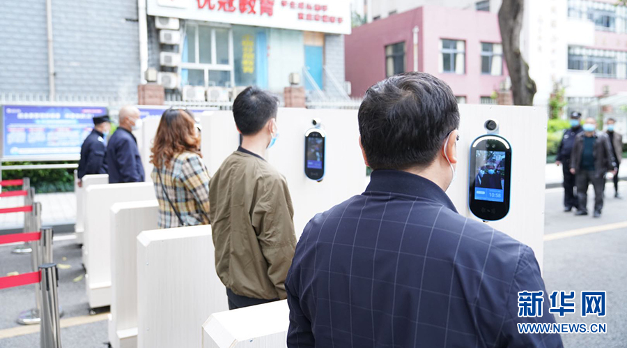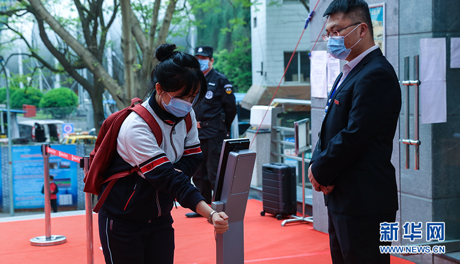 在重慶市第一中學(xué),大校門設(shè)置了多條紅外線成像體溫測控通道,能夠快速檢測到師生體溫并清楚顯示。學(xué)生從通道經(jīng)過時,紅外線測溫儀會及時監(jiān)測通過者體溫,若有體溫異常者,設(shè)備會報(bào)警。圖為學(xué)校老師演習(xí)進(jìn)校場景。新華網(wǎng)發(fā)