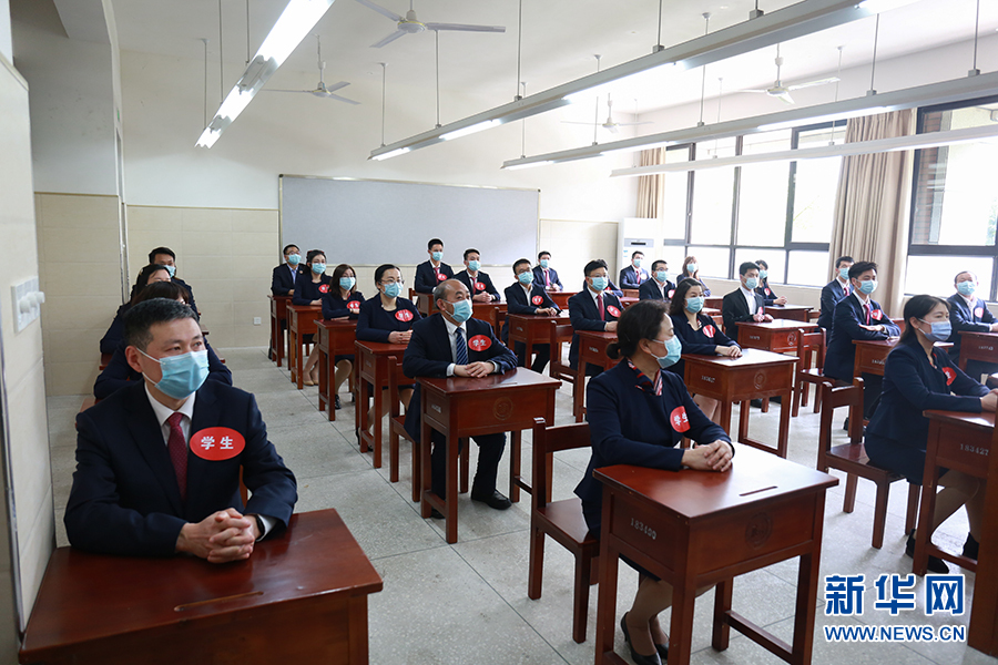在重慶市第八中學(xué)教室內(nèi),學(xué)生座位保持了一定間距,學(xué)生單人單座,盡量避免上課期間相互接觸。圖為教師演練上課場景。新華網(wǎng)發(fā)