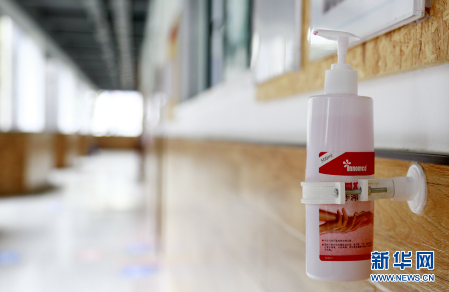 在教室、走廊、寢室等人流密集的場合,重慶市第十一中學(xué)配備了免洗消毒液供師生使用。新華網(wǎng) 彭博攝