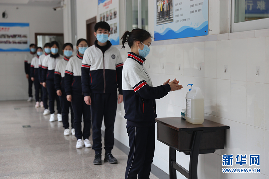 在西南大學(xué)附屬中學(xué),上課前學(xué)生需提前洗手,在教室外間隔1米左右排隊(duì)等待班主任檢查后進(jìn)入教室上課。班主任將戴好一次性醫(yī)用口罩和一次性手套逐一對學(xué)生進(jìn)行體溫檢查,并做好檢查登記。圖為學(xué)生演習(xí)進(jìn)教室環(huán)節(jié)。新華網(wǎng)發(fā)