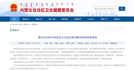 截至2020年4月19日24時,內(nèi)蒙古自治區(qū)報告無癥狀感染者0例。