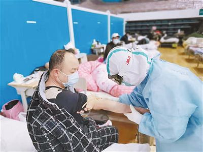對(duì)于護(hù)理醫(yī)療隊(duì)的隊(duì)員們來說,在洪山體育館武昌方艙醫(yī)院的每一天,都是那么緊張。護(hù)理人員需快速對(duì)新入院的患者實(shí)施入院流程管理,觀察病情、監(jiān)測(cè)病人生命體征,及時(shí)將不適合入院的患者分診出轉(zhuǎn)至定點(diǎn)醫(yī)院;在為患者做好血氧監(jiān)測(cè)、體溫監(jiān)測(cè)等??谱o(hù)理的同時(shí),還包攬了喂飯、喂藥、翻身、擦洗、換衣、大小便管理等各種貼身護(hù)理工作。這些看起來簡(jiǎn)單的工作,卻因?yàn)橐诜雷o(hù)服、口罩、護(hù)目鏡等防護(hù)裝備的層層包裹下進(jìn)行,變得異常吃力。最忙的時(shí)候,3個(gè)護(hù)士要同時(shí)護(hù)理82名患者,但隊(duì)員們憑著自身過硬的護(hù)理經(jīng)驗(yàn),攻克了一個(gè)又一個(gè)難關(guān)。