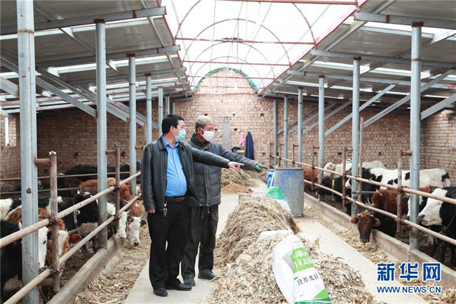 在甘肅省臨夏回族自治州廣河縣莊窠集鎮(zhèn)西坪村,全國人大代表馬天龍(左)和養(yǎng)牛戶馬志德討論養(yǎng)殖問題(3月10日攝)。新華社發(fā)(杜哲宇 攝)