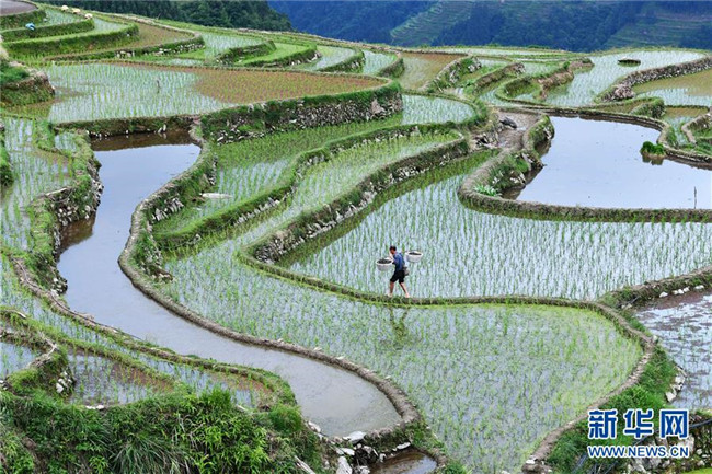 5月26日,貴州省從江縣加榜鄉(xiāng)加車村的村民在梯田上播撒種螺。