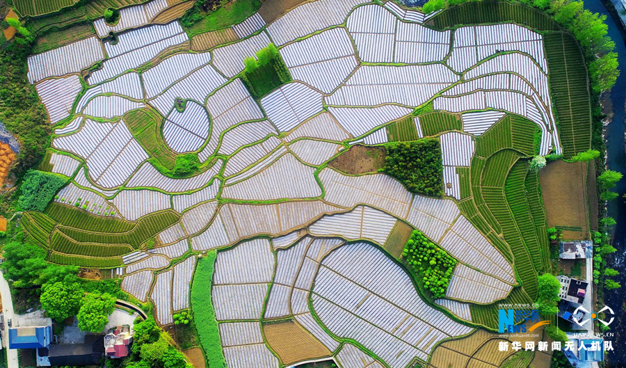 無人機視角下的重慶市酉陽龍?zhí)舵?zhèn)柏香村示范農(nóng)田。新華網(wǎng)發(fā)(陳碧生 攝)