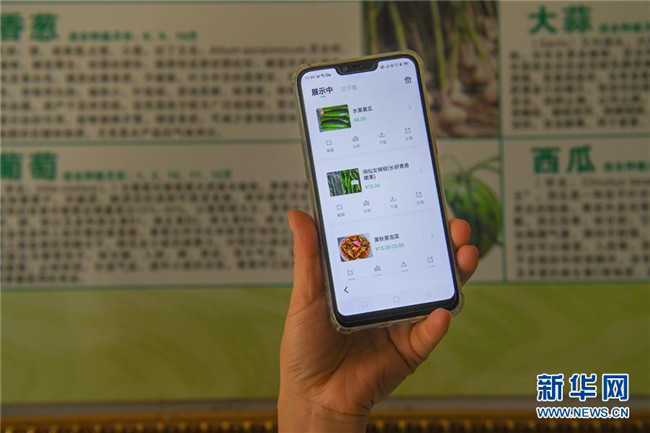 6月4日,在湘潭市雨湖區(qū)鶴嶺鎮(zhèn)龍安村,湘潭市仙女蔬菜產(chǎn)銷專業(yè)合作社的工作人員展示農(nóng)產(chǎn)品的微信購買頁面。新華社記者 陳澤國 攝