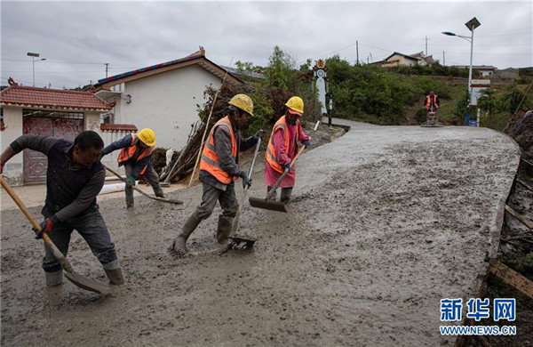 四川路橋公司的工人在金陽(yáng)縣依達(dá)鄉(xiāng)保爾村對(duì)破損路面進(jìn)行整治(6月5日攝)。坐落在金沙江畔的四川省金陽(yáng)縣是國(guó)家級(jí)深度貧困縣,境內(nèi)群山連綿起伏,海拔落差大,眾多村寨處于高山或者高半山上,道路施工難度大。近年來(lái),當(dāng)?shù)卣畬⒔煌ㄗ鳛槊撠毠?jiān)的先導(dǎo)性工程,路越修越寬、越修越好,成為當(dāng)?shù)厝罕姷拿撠氈赂宦?。截?019年底,金陽(yáng)縣實(shí)現(xiàn)所有鄉(xiāng)鎮(zhèn)通油路、建制村通硬化路,鄉(xiāng)道里程達(dá)329.9公里,村道里程達(dá)866.8公里。新華社記者江宏景攝