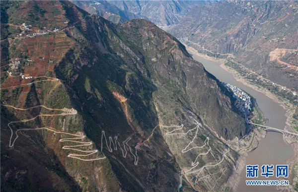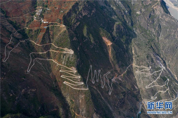 金陽(yáng)縣蘆稿鎮(zhèn)大灣子村12公里左右的通村公路,28個(gè)彎蜿蜒盤旋在金沙江峽谷懸崖絕壁邊(6月7日攝,無(wú)人機(jī)照片)。坐落在金沙江畔的四川省金陽(yáng)縣是國(guó)家級(jí)深度貧困縣,境內(nèi)群山連綿起伏,海拔落差大,眾多村寨處于高山或者高半山上,道路施工難度大。近年來(lái),當(dāng)?shù)卣畬⒔煌ㄗ鳛槊撠毠?jiān)的先導(dǎo)性工程,路越修越寬、越修越好,成為當(dāng)?shù)厝罕姷拿撠氈赂宦?。截?019年底,金陽(yáng)縣實(shí)現(xiàn)所有鄉(xiāng)鎮(zhèn)通油路、建制村通硬化路,鄉(xiāng)道里程達(dá)329.9公里,村道里程達(dá)866.8公里。新華社記者江宏景攝