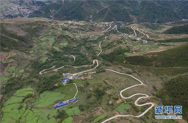 金陽(yáng)縣天地壩鎮(zhèn)通往吉史里口村易地扶貧搬遷集中安置點(diǎn)的道路(6月7日攝,無(wú)人機(jī)照片)。坐落在金沙江畔的四川省金陽(yáng)縣是國(guó)家級(jí)深度貧困縣,境內(nèi)群山連綿起伏,海拔落差大,眾多村寨處于高山或者高半山上,道路施工難度大。近年來(lái),當(dāng)?shù)卣畬⒔煌ㄗ鳛槊撠毠?jiān)的先導(dǎo)性工程,路越修越寬、越修越好,成為當(dāng)?shù)厝罕姷拿撠氈赂宦?。截?019年底,金陽(yáng)縣實(shí)現(xiàn)所有鄉(xiāng)鎮(zhèn)通油路、建制村通硬化路,鄉(xiāng)道里程達(dá)329.9公里,村道里程達(dá)866.8公里。新華社記者江宏景攝