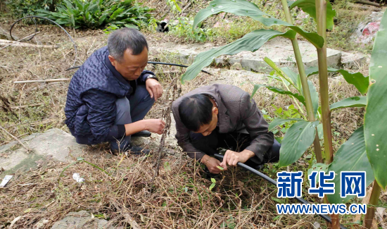 張紹淦(左一)在山上檢查自來(lái)水管道。新華網(wǎng)發(fā)(重慶稅務(wù)供圖)