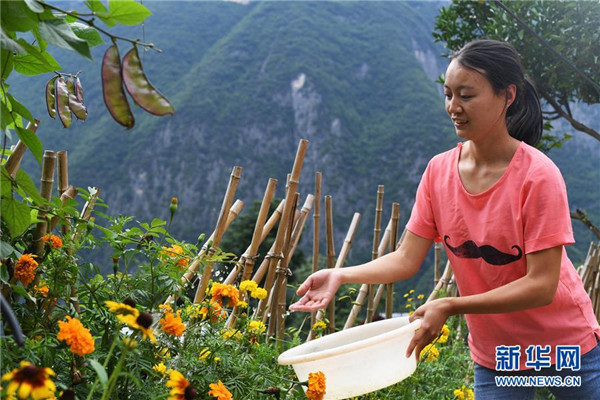 7月3日,26歲的下莊村村民龍云在自家院子里給花澆水。新華社記者王全超攝