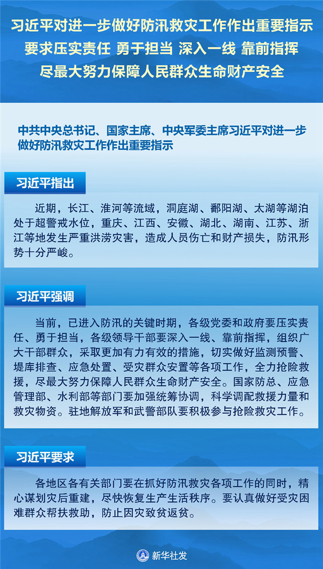 中共中央總書記、國家主席、中央軍委主席習(xí)近平對(duì)進(jìn)一步做好防汛救災(zāi)工作作出重要指示。