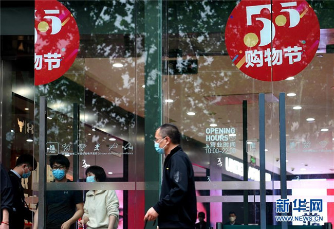 這是上海淮海路一家商場(chǎng)的“五五購(gòu)物節(jié)”標(biāo)識(shí)(5月5日攝)。5月4日晚,上海首次啟動(dòng)大規(guī)模商業(yè)促銷活動(dòng)“五五購(gòu)物節(jié)”,多家在線新經(jīng)濟(jì)企業(yè)參與。 新華社記者 劉穎 攝