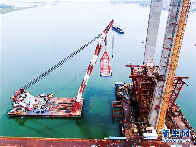 這是5月29日拍攝的廣東湛江調(diào)順跨海大橋施工現(xiàn)場(chǎng)(無(wú)人機(jī)照片)。 新華社記者 盧燁 攝