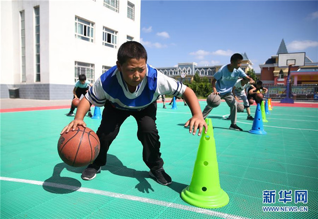7月22日,學生在石嘴山市大武口區(qū)青少年學生校外活動中心籃球場上練習運球。 新華社記者 賈浩成 攝