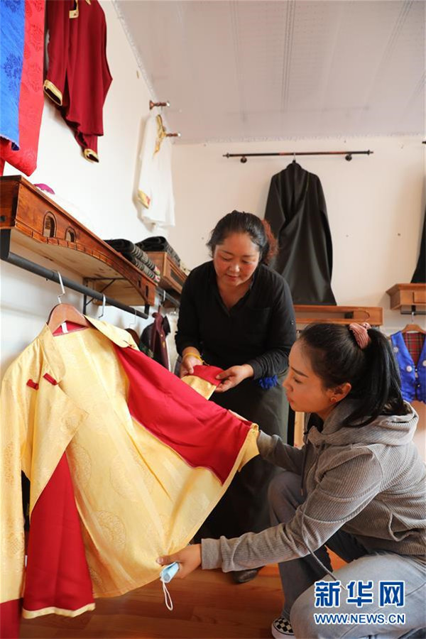 7月23日,在甘肅省甘南藏族自治州夏河縣??奇?zhèn)崗岔村的扶貧車間內(nèi),卓瑪吉(右)和扶貧車間負(fù)責(zé)人研究成衣款式。崗岔村是甘肅省甘南藏族自治州夏河縣桑科鎮(zhèn)的一個(gè)牧業(yè)村,平均海拔3000米以上。2018年,在夏河縣文明辦工作的卓瑪吉開始擔(dān)任駐村幫扶工作隊(duì)隊(duì)長(zhǎng),每年都有200多天待在草原上。兩年來(lái),卓瑪吉帶領(lǐng)大家開辦扶貧車間,發(fā)展特色產(chǎn)業(yè),聯(lián)系勞務(wù)輸出。為了讓村民更全面地了解精準(zhǔn)扶貧政策,卓瑪吉登門宣講政策。為了提高村容村貌,卓瑪吉發(fā)動(dòng)大家開展廁所革命和庭院環(huán)境評(píng)比,積極響應(yīng)甘南藏族自治州“全域無(wú)垃圾”創(chuàng)建行動(dòng)。她還從縣城請(qǐng)來(lái)醫(yī)生,為村民舉辦健康講座,在全村婦女中開展“兩癌篩查”。如今,崗岔村變成了干凈、整齊、富裕、美麗的生態(tài)文明村,提前實(shí)現(xiàn)了整村脫貧。談起心愿,卓瑪吉說(shuō):“要讓草原和草原上的人都變得更美。”新華社發(fā)(杜哲宇攝)