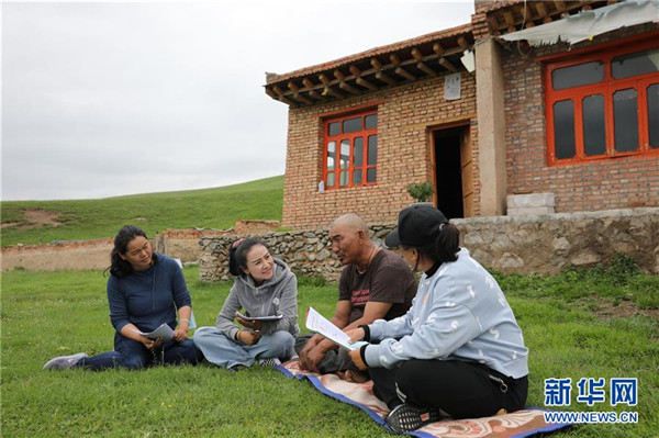 7月23日,在甘肅省甘南藏族自治州夏河縣??奇?zhèn)崗岔村,卓瑪吉(左二)和駐村幫扶工作隊(duì)隊(duì)員一起入戶了解村民巴桑一家的生產(chǎn)生活情況。崗岔村是甘肅省甘南藏族自治州夏河縣??奇?zhèn)的一個(gè)牧業(yè)村,平均海拔3000米以上。2018年,在夏河縣文明辦工作的卓瑪吉開始擔(dān)任駐村幫扶工作隊(duì)隊(duì)長(zhǎng),每年都有200多天待在草原上。兩年來(lái),卓瑪吉帶領(lǐng)大家開辦扶貧車間,發(fā)展特色產(chǎn)業(yè),聯(lián)系勞務(wù)輸出。為了讓村民更全面地了解精準(zhǔn)扶貧政策,卓瑪吉登門宣講政策。為了提高村容村貌,卓瑪吉發(fā)動(dòng)大家開展廁所革命和庭院環(huán)境評(píng)比,積極響應(yīng)甘南藏族自治州“全域無(wú)垃圾”創(chuàng)建行動(dòng)。她還從縣城請(qǐng)來(lái)醫(yī)生,為村民舉辦健康講座,在全村婦女中開展“兩癌篩查”。如今,崗岔村變成了干凈、整齊、富裕、美麗的生態(tài)文明村,提前實(shí)現(xiàn)了整村脫貧。談起心愿,卓瑪吉說(shuō):“要讓草原和草原上的人都變得更美。”新華社發(fā)(杜哲宇攝)