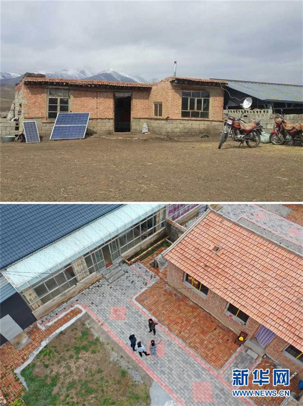 拼版照片:上圖為崗岔村村民才讓扎西在易地扶貧搬遷之前居住的房子(資料照片)。下圖為才讓扎西易地扶貧搬遷后的新家(7月23日攝,無(wú)人機(jī)照片)。新華社發(fā)(杜哲宇攝)崗岔村是甘肅省甘南藏族自治州夏河縣??奇?zhèn)的一個(gè)牧業(yè)村,平均海拔3000米以上。2018年,在夏河縣文明辦工作的卓瑪吉開始擔(dān)任駐村幫扶工作隊(duì)隊(duì)長(zhǎng),每年都有200多天待在草原上。兩年來(lái),卓瑪吉帶領(lǐng)大家開辦扶貧車間,發(fā)展特色產(chǎn)業(yè),聯(lián)系勞務(wù)輸出。為了讓村民更全面地了解精準(zhǔn)扶貧政策,卓瑪吉登門宣講政策。為了提高村容村貌,卓瑪吉發(fā)動(dòng)大家開展廁所革命和庭院環(huán)境評(píng)比,積極響應(yīng)甘南藏族自治州“全域無(wú)垃圾”創(chuàng)建行動(dòng)。她還從縣城請(qǐng)來(lái)醫(yī)生,為村民舉辦健康講座,在全村婦女中開展“兩癌篩查”。如今,崗岔村變成了干凈、整齊、富裕、美麗的生態(tài)文明村,提前實(shí)現(xiàn)了整村脫貧。談起心愿,卓瑪吉說(shuō):“要讓草原和草原上的人都變得更美。”新華社發(fā)
