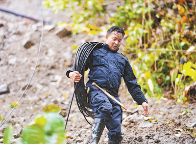 阿旺背著光纜在查找線(xiàn)路斷點(diǎn)。本報(bào)記者 徐馭堯攝
