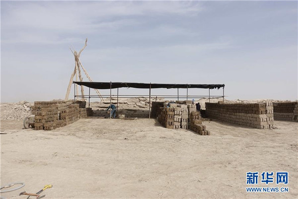 工作人員選取樓蘭古城外圍的土料制備土坯(7月1日攝)。新華社發(fā)(中鐵西北科學研究院有限公司提供)