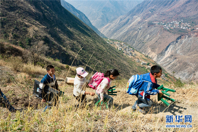 李本艷姐弟倆從家門口沿著崎嶇的山路走到學校,要近兩個小時,每走一步,腳下都是數百米高的懸崖。搬家后,姐弟倆帶著書包和小板凳離開(攝于4月1日)。新華網發(fā)(鮑禹 攝)