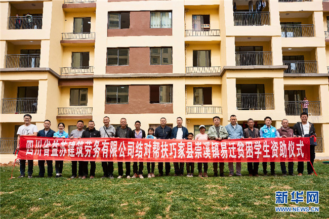 經過中建二局志愿者的牽線搭橋,四川一勞務公司老板涂永林決定資助李本艷姐弟倆到大學畢業(yè)。在李本艷的新家樓下,雙方舉行了簡單的資助儀式(攝于4月3日)。新華網發(fā)(鮑禹 攝)