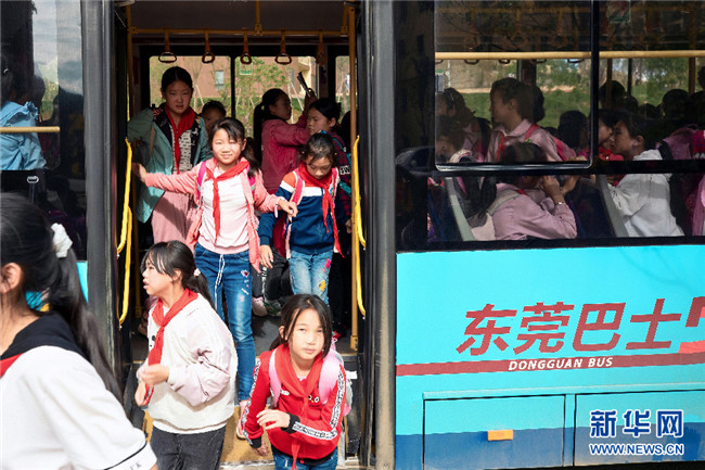 如今,李本艷姐弟倆從卯家灣家門口坐上東莞愛心巴士,25分鐘就可到學校(攝于7月3日)。新華網發(fā)(鮑禹 攝)