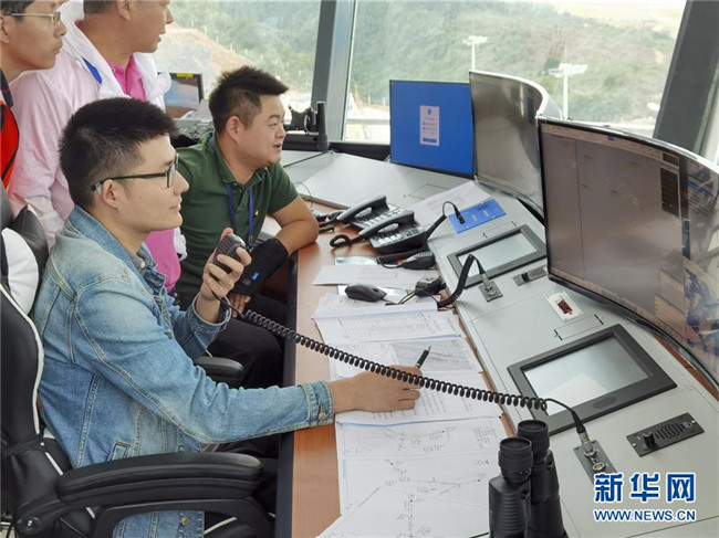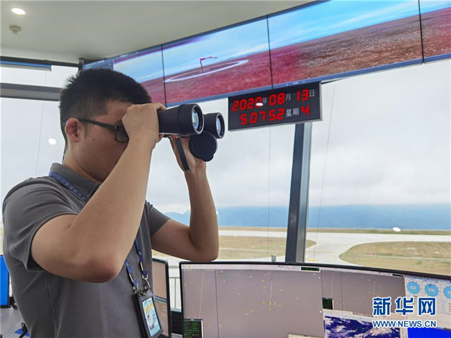 8月13日,參加校飛的地面工作人員在仙女山機(jī)場的塔臺工作區(qū)內(nèi)工作。 新華社記者 劉潺 攝